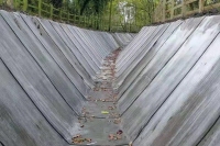 產品規格:厚度可達0.5㎝ 到1.5cm之間,幅寬 1—4 m,長度可定制, 特殊規格可議。使用簡便,產品成卷,寬度 長度定制便于施工裝卸, 不需大型機械,方便人工裝卸和運輸。水泥配方科學配置應用于不同場 景,無需現場攪拌,鋪設完畢澆水即可,迅速凝固成型,綜合成本低等 優點。環境友好:該產品低碳,含堿量低,沖刷率低,對生態影響小。 應用靈活:產品懸垂性、柔韌性好,可根據不同場景的形狀順勢施工。強度高: 產品內部纖維增強材料起到防止開裂的作用,并且吸收沖擊 能量,增強抗沖擊強度。 耐久性好:抗化學因素和自然因素侵蝕能力強(紫外線等)。 1.混凝土護坡固化毯有一定的韌性,對于地基環境要求低,不易開 裂; 2.使用壽命長,可達 10 年以上,保養維護成本低,施工簡單方便; 3.比傳統水泥施工預制綜合成本低。 抗沖擊強度:≥6kJ/㎡ 抗拉極限強度:≥4 ㎫ 抗壓強度:≥40 ㎫ 應用領域:水利工程、交通工程、農業養殖工程、環境工程、海洋工 程等。 鋪設施工 1.準備工作:首先要規劃,測量,保證一定的坡度,使水流能從上端暢流 入下端;第二要將施工地清理平整后,按照設計圖設置施工線,復測排水 坡度。 2.開挖:按照設計要求設置施工線,溝渠兩側需要平整,溝內坡面不得有 虛土和空洞。要求水害部位夯實處理,除盡坡內雜物碎石等,必要時使用 三七灰土夯實處理,或注漿加固后進行封閉,要求處理后的部位穩定性良 好! 3.鋪設:材料可縱·橫向鋪設。請務必將基底整理平整,否則會影響外觀 質量! 4.接縫處理: ①在相鄰兩塊水泥毯疊壓處橫向挖寬 10 ㎝,深度為水泥毯的凹坑, 將疊壓處水泥毯接頭放入并壓平。②沿水流方向將上面的水泥毯壓在下面水泥毯上,疊加處不得少于 10 厘米。 ③在接縫處均勻的抹上密封膠。(或者均勻撒上水泥粉) ④用不銹鋼螺絲釘將兩片水泥毯固定。 ⑤溝沿處理,用鉚釘將材料邊緣固定子啊溝沿上,疊加處也用 鉚釘固定,固定好后用圖覆蓋邊緣即可 ⑥前期工作完成后,澆水均勻寖透,12 小時后再次均勻淋水進行 養護,周期三天。